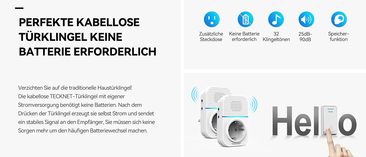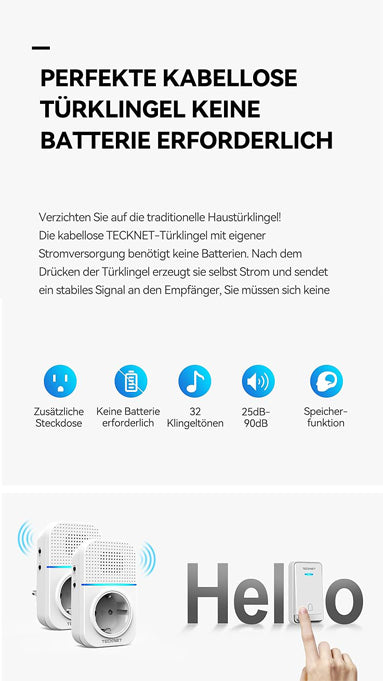 TECKNET Kabellose Türklingel mit eigener Stromversorgung, kabellose Türklingel zum EinsteckenTECKNET
