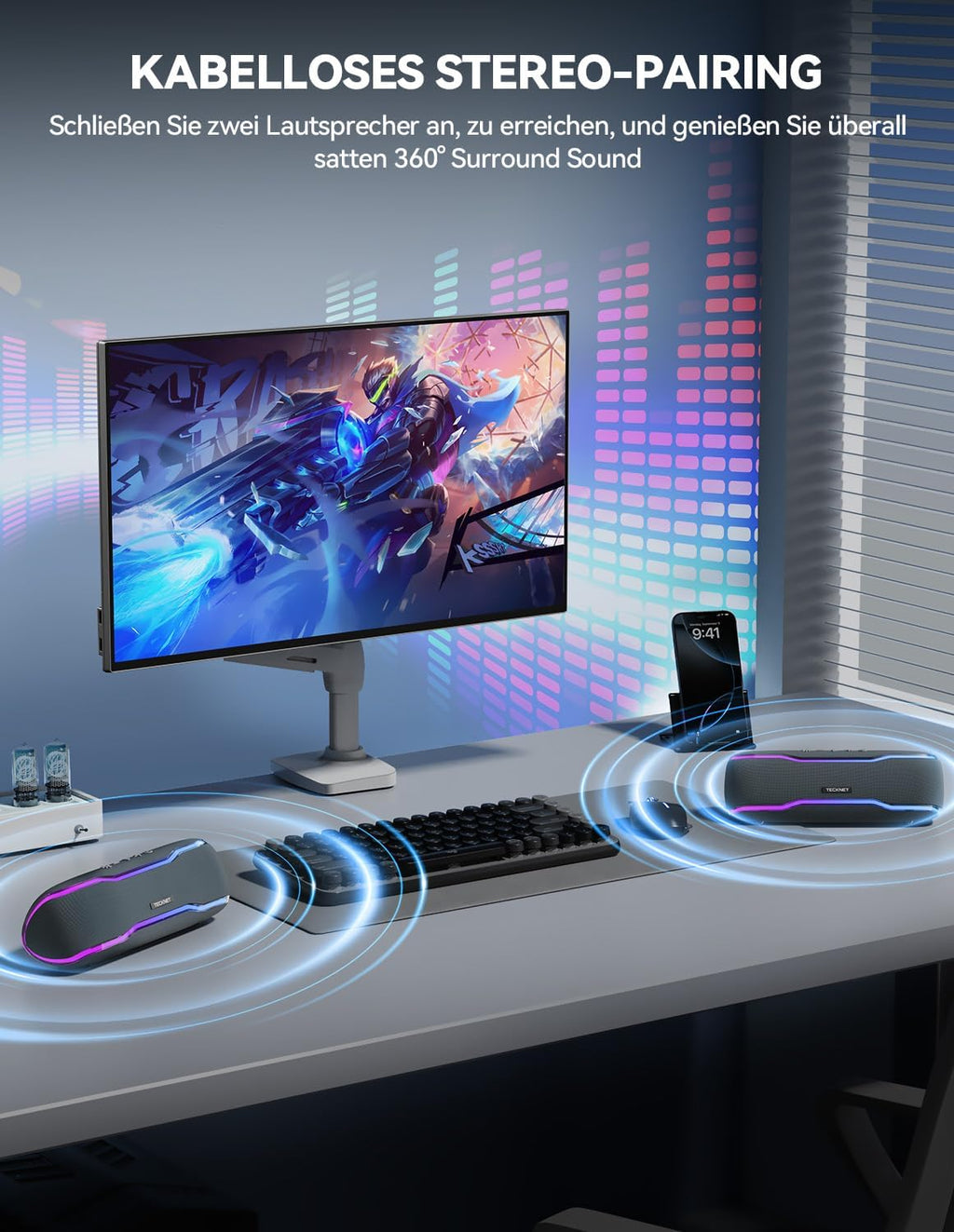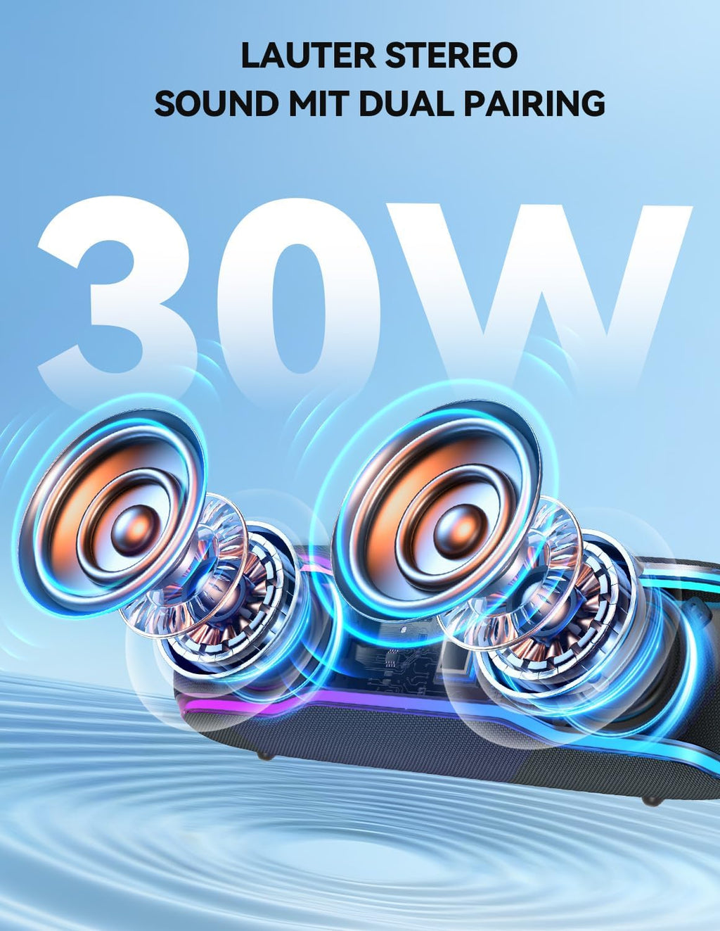 Der Bluetooth Lautsprecher mit Licht unterstützt eine hohe Ausgangsleistung von 30 W. Zwei Lautsprecher können gleichzeitig konfiguriert werden, um eine 100 % synchronisierte Wiedergabe zu erzielen, wodurch die Wirkung und räumliche Präsenz des Klangs weiter verbessert werden.