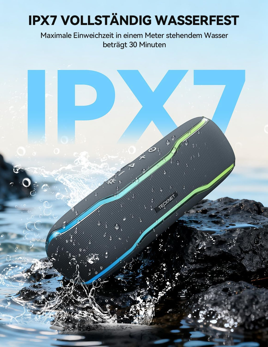 Der Bluetooth Party Lautsprecher Outdoor ist gemäß IPX7 wasserdicht und somit vor Regen, Spritzwasser und sogar kurzzeitigem Eintauchen in bis zu 1 Meter tiefes Wasser geschützt, wodurch er sich ideal für den Einsatz im Freien eignet.