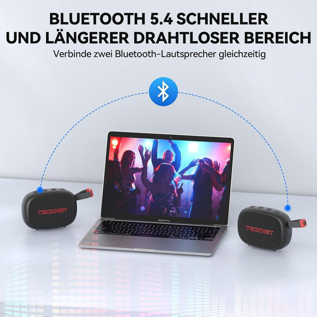 Erleben Sie eine stabile Verbindung mit Bluetooth 5.4 der nächsten Generation. Ein einzelnes Gerät kann gleichzeitig mit zwei TECKNET H108 Lautsprechern verbunden werden, um über die TWS-Technologie ein immersives Stereo-Klangerlebnis zu schaffen. Bitte beachten Sie, dass die Lautsprecher nicht gleichzeitig Audio von mehreren Quellgeräten empfangen können, um ein stabiles und ungestörtes Hörerlebnis zu gewährleisten.