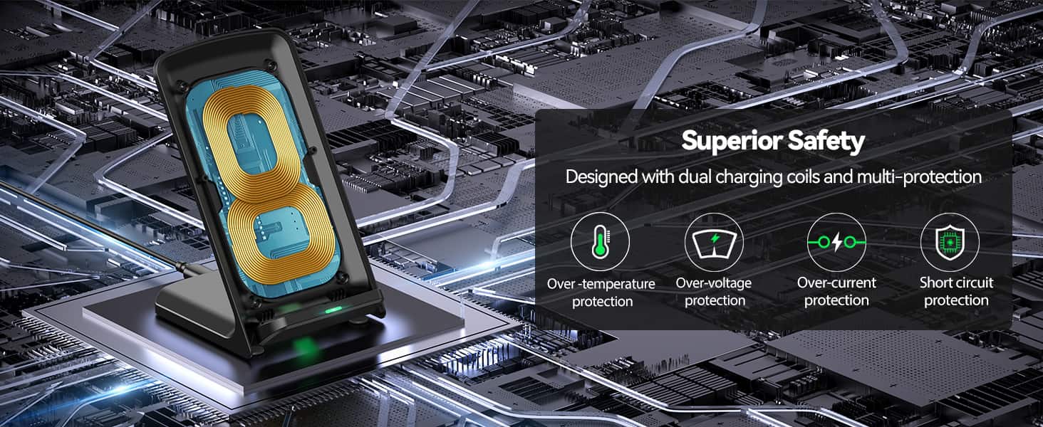 Das kabellose Ladegerät regelt die Temperatur in Echtzeit intelligent und geräuschlos über den hochmodernen NTC Temp°Guard, um den Akku Ihres Telefons vor Überhitzung/Überspannung/Kurzschluss und Beschädigung zu schützen.