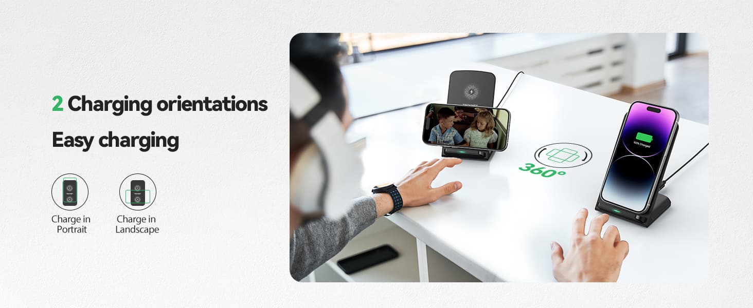Der kabellose Ladeständer unterstützt eine Ausgangsleistung von 15W/ 5W/7.5 W/10W, die maximale Ladeleistung kann 15 W erreichen und die Ladezeit beträgt 60 Minuten weniger als beim normalen kabellosen Laden mit 10W.