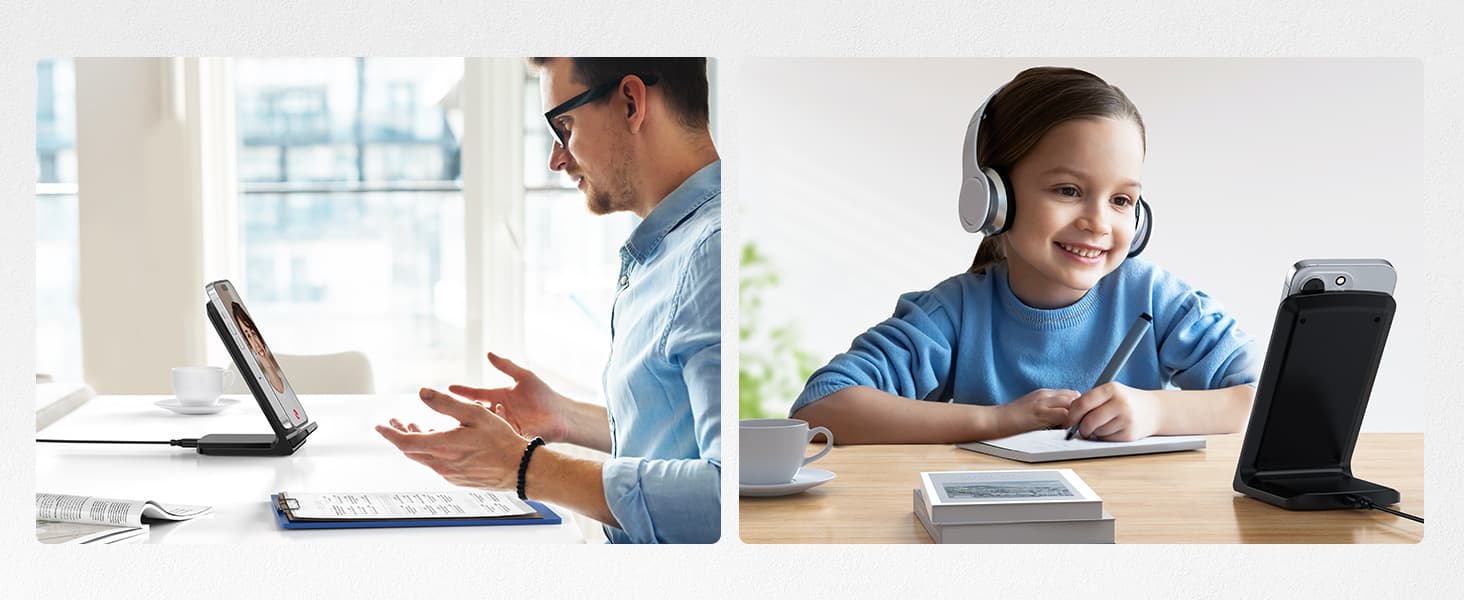 Mit der integrierten Doppelspule des kabellosen Samsung-Ladegeräts können Sie Videos im Querformat ansehen oder für FaceTime-Anrufe im Hochformat stehen. Mit einem 1,2 m langen Ladekabel können Sie das Gerät frei bedienen.